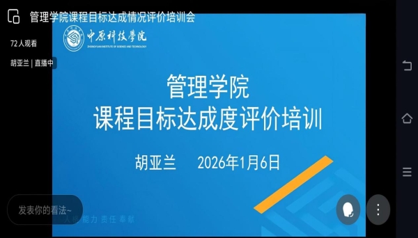 1月6日上午,学院组织全体教师在线参加了由副院长胡亚兰主讲的“课程目标达成度评价”专题培训。胡院长系统阐述了课程目标达成度评价的重要意义,强调课程目标应与毕业要求、教学大纲相对应,并明确每门课程应设置3至5个课程目标,其中至少包含一个思政育人目标。培训重点讲解了“毕业要求—课程体系对应矩阵”的构建方法,以及课程目标达成度的具体计算流程,为教师科学开展课程评价、持续改进教学质量提供了清晰指引。