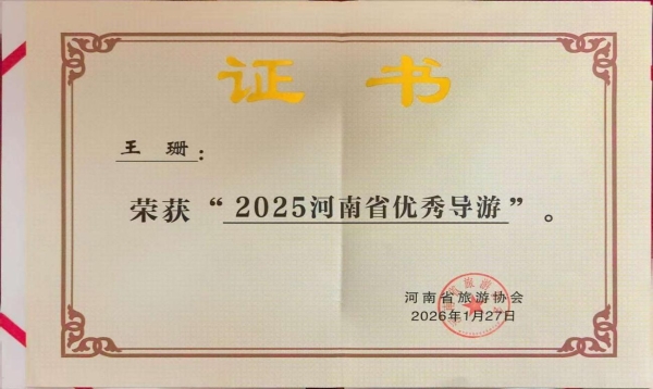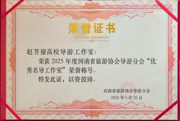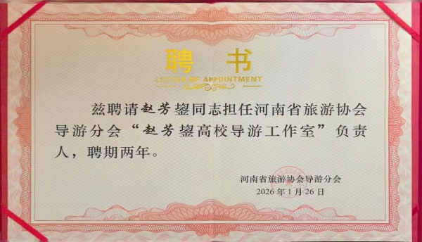 凭借在产教融合、文旅人才培养及文化传播方面的卓越表现,赵芳鋆高校导游工作室从众多参评单位中脱颖而出,荣获2025年度河南省旅游协会导游分会“优秀名导工作室”荣誉称号;工作室骨干成员王珊荣获“2025河南省优秀导游”荣誉。大会现场正式宣布聘任赵芳鋆同志担任2026年河南省旅游协会导游分会“赵芳鋆高校导游工作室”负责人,聘期两年。这不仅是行业协会对工作室过去辛勤耕耘的高度认可,也是对工作室团队既站得稳三尺讲台,又讲得好中原故事的充分肯定。